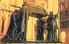 TUMBA DE CRISTÓBAL COLÓN EN SEVILLA, ESPAÑA Un conocido investigador español llamado Nito Verdera afirma que los restos de Colón fueron divididos, y una parte de ellos se encuentra en Santo Domingo y la otra parte en Sevilla. Un verdadero disparate, pues los restos del navegante fueron llevados, después de su muerte en Valladolid, a Génova, su ciudad natal, y enterrados allí.